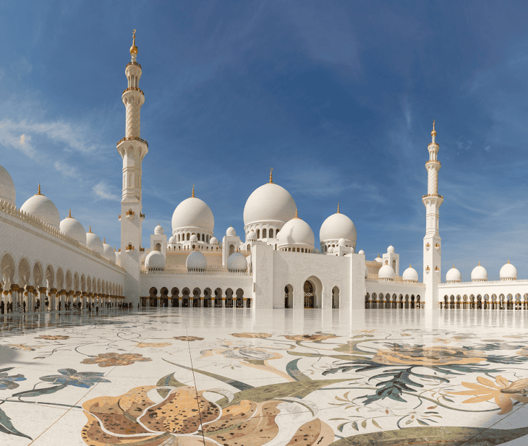 Start your trip with the Sheikh Zayed Grand Mosque, one of the largest and most beautiful mosques in Dubai. Its white marble domes, detailed carvings, and calm reflecting pools make it an unforgettable sight.